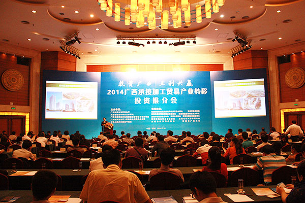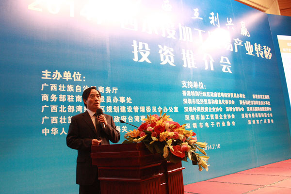 2014年7月16日,由自治區(qū)商務(wù)廳主辦的2014廣西承接加工貿(mào)易產(chǎn)業(yè)轉(zhuǎn)移投資推介會在深圳舉行。自治區(qū)政府副秘書長魏然,深圳市經(jīng)濟(jì)貿(mào)易和信息化委員會副主任高林等領(lǐng)導(dǎo)和嘉賓為會議致辭。自治區(qū)商務(wù)廳、北部灣辦分別從不同角度對廣西承接加工貿(mào)易產(chǎn)業(yè)轉(zhuǎn)移投資環(huán)境進(jìn)行了推介。北海、欽州、梧州、南寧四個國家級加工貿(mào)易梯度轉(zhuǎn)移重點(diǎn)承接地,欽州保稅港區(qū)、憑祥綜合保稅區(qū)、北海出口加工區(qū)、中馬欽州產(chǎn)業(yè)園、東興國家重點(diǎn)開發(fā)開放試驗區(qū)、南寧高新技術(shù)產(chǎn)業(yè)開發(fā)區(qū)、中國電子北海產(chǎn)業(yè)園、梧州市粵桂合作特別實驗區(qū)八個重點(diǎn)園區(qū),分別就各自的產(chǎn)業(yè)布局、投資環(huán)境、政策優(yōu)勢進(jìn)行了推介。香港特區(qū)政府駐粵辦、香港貿(mào)易發(fā)展局、深圳外商投資企業(yè)協(xié)會、深圳臺商協(xié)會、深圳市加工貿(mào)易企業(yè)協(xié)會、深圳市企業(yè)聯(lián)合會、深圳市電子行業(yè)協(xié)會及廣東各類加工貿(mào)易企業(yè)約400人出席了推介會。